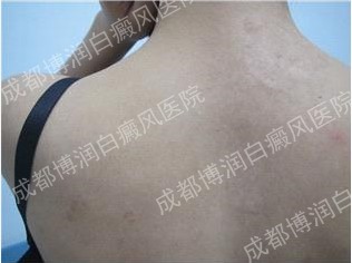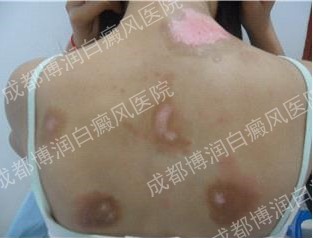 【来院初诊时,患者背部的白斑通过之前的治疗已有黑色素产生,但是停药就复发扩散】