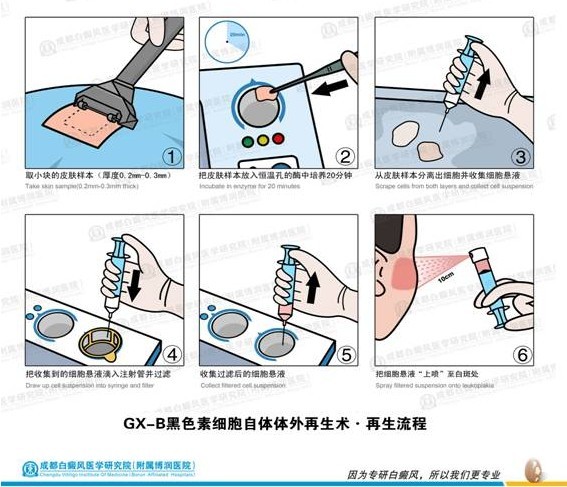 GX-B黑色素细胞自体体外再生术的核心技术便是黑素细胞自体体外再生,与以往的自体表皮移植方法所不同的是,该方法避开了治疗后色素范围扩大现象不明显或过于明显的状况,也突破了自体表皮移植方法一次性治疗面积受限、面积较大的需多次治疗的局限。黑色素细胞自体体外再生便是首先从患者正常皮肤取一片薄的皮片,用Recell一次性独立自体细胞搜集器制成的活细胞悬液培养,促成黑素细胞体外再生,从而“上喷”在创面,从而达到黑素细胞的恢复,迅速使皮肤的正常色素沉着,治疗部位能快速愈合不留瘢痕。 其具体的技术过程看似并不复杂。在20分钟内,用Zimmer取皮器在白癜风患病部位附近取正常表皮的小块薄的皮片,通过Recell独立自体细胞搜集器制成自体细胞悬液,细胞悬液含角质细胞(KC)和黑素细胞(MC)等。在制成细胞悬液的同时,局部麻醉患病部位,磨削治疗区域直到出现点状出血。用浸湿的纱布按压止血,细胞悬液喷到创面,用敷料覆盖,同时用其它药物5天。治疗后第7天移除敷料,无炎症,无感染;治疗后2~3周,治疗部位上皮逐渐恢复到正常厚度,皮肤颜色逐渐加深;治疗后第16周,皮肤色素沉着效果明显;治疗后6个月,皮肤颜色与正常颜色相同。 真正复杂的是细胞悬液的培养。这是经过多位国际知名皮肤病专家多年潜心研究未果,而来自澳大利亚的菲奥娜·梅拉妮·伍德(Fiona Melanie Wood)教授独家配制而成。该培养液的成分目前属于保密阶段,除伍德教授及研究组成员掌握外,并无科学家能分析出其成分构成。而角质细胞和黑素细胞迅速共体培养且时间仅为20分钟,这在世界上并没有别的医学专家能够达到。这种技术一方面能合理调节黑素细胞的增殖与分化,另一方面也能维护黑素细胞的功能与形态。