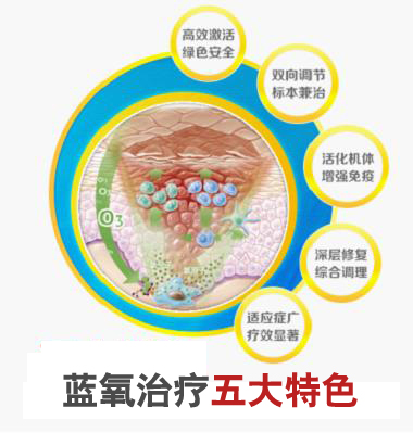 通过特殊处理的活性氧成分能够改变脂质分子功能,从而帮助免疫细胞活化,提高其对外来抗原的敏感性,有助于机体清除病原体。激活修复黑色素细胞获取营养的供应通道,使黑色素细胞正常营养供应,提高体内免疫指标,在根本上调节致病因子、防止链状的形成,从而达到彻底治疗的目的。