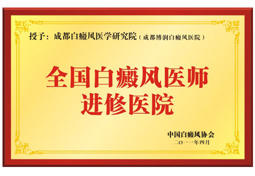 2011年4月,在四川省成都召开的“西南首届GX-B白癜风康复工程高峰论坛暨中国白癜风名医堂临床推广研讨会”上,成都白癜风医学研究院附属博润医院凭借汇集了一批知识渊博、造诣深厚的专家学者,各有所长、各有所专,拥有一支极富经验的白癜风科研与临床治疗的专家队伍等多方面的平台优势,被中国白癜风协会授予“全国白癜风医师进修医院”的荣誉称号。