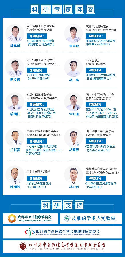2018年,安徽医科大学皮肤病学教育部重点实验室及复旦大学皮肤病研究所牵头下,成立“白癜风精准医学研究联盟”。通过与皮肤病学教育部重点实验室的紧密合作,成都博润白癜风医院成立白癜风临床试验研究中心,于四川地区开启流行病学调查及临床技术课题,并于成都市卫健委申报课题成功立项。